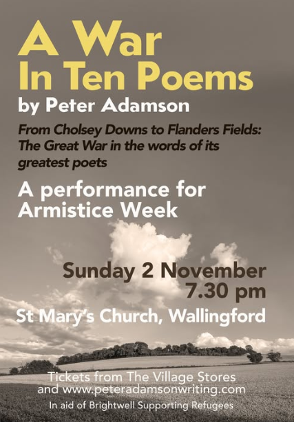 War in Ten Poems from Cholsey Downs to Flanders Fields- the Great War in the words of its greatest poets. Peter Adamson and friends are hosting an event in aid of Brightwell Supporting Refugees, on Sunday 2nd November in St Mary-le-More Parish Church, Wallingford.